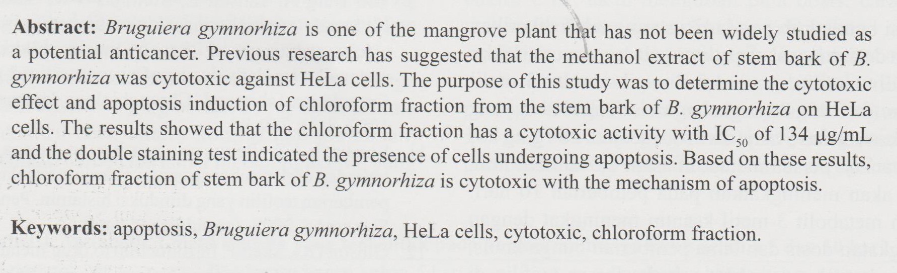 apoptosis, Bruguiera gymnorhiza, HeLa cells, cytotoxic, chloroform fractionAbstract