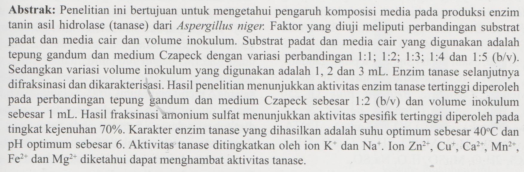PENGARUH KOMPOSISI MEDIA TERHADAP AKTIVITAS DAN KARAKTER ENZIM TANNIN ASIL HIDROLASE DARI ASPERGILLUS NIGER